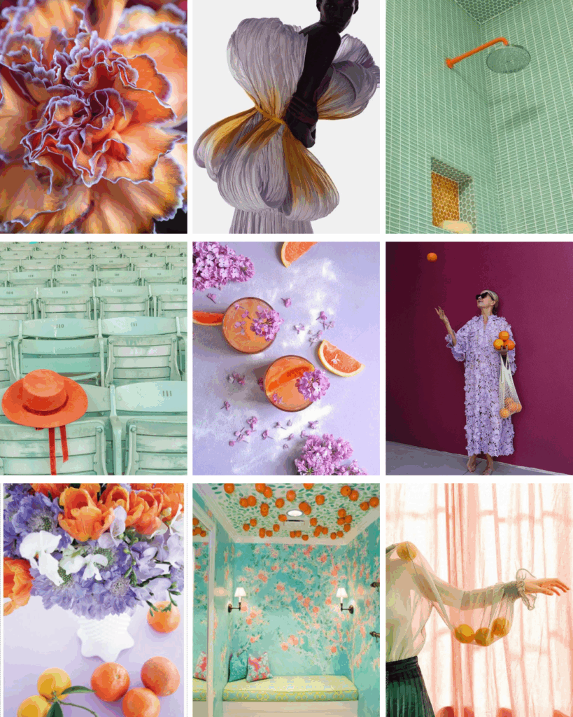 WHIMSICAL + FEMININE: A playful clash of apricot, lilac, and mint. Fluttering textiles, citrus cocktails, and floral detailing that feels airy, effervescent, and full of life. Proof that orange doesn’t have to be bold to be expressive.