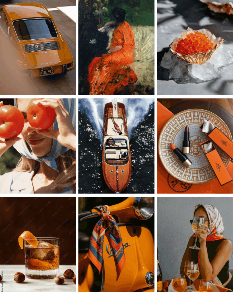 OLD-MONEY CHIC: An ode to European leisure: silk scarves, Italian sport boats, golden-hour cocktails. Orange here leans heavily into brown tones and speaks the language of heritage—equal parts glamour and ease. Think Amalfi in autumn or Hermès in high summer. Either with a bottle of Veuvu.