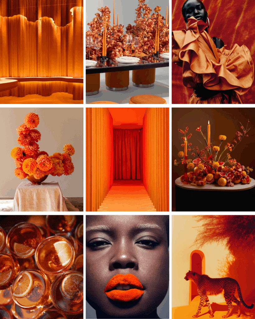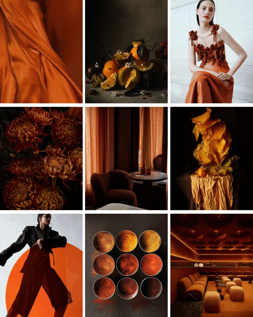 MOODY + REFINED: Think candlelit luxury and European restraint. Decadent and sultry. Burnt amber, rust, and spice tones paired with silk, velvet, and natural still-life textures. It’s orange at its most sophisticated—where warmth meets quiet opulence.