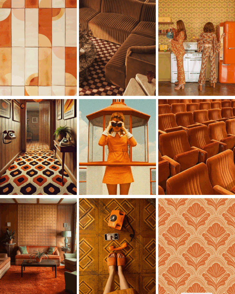 RETRO REVIVAL: 1970s nostalgia done right. Patterned wallpaper, corduroy sofas, rotary phones, and sun-soaked interiors—orange as comfort and character. Perfect for couples embracing warmth, humor, and a wink to vintage.