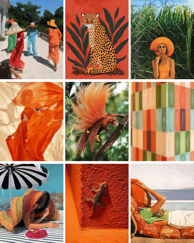 TROPICAL MODERNISM: Vibrant, kinetic, sun-drenched. A celebration of movement and saturation—bold resortwear, tropical botanicals, striped textiles, and cinematic light. Orange here feels alive, expansive, and joyfully untamed.